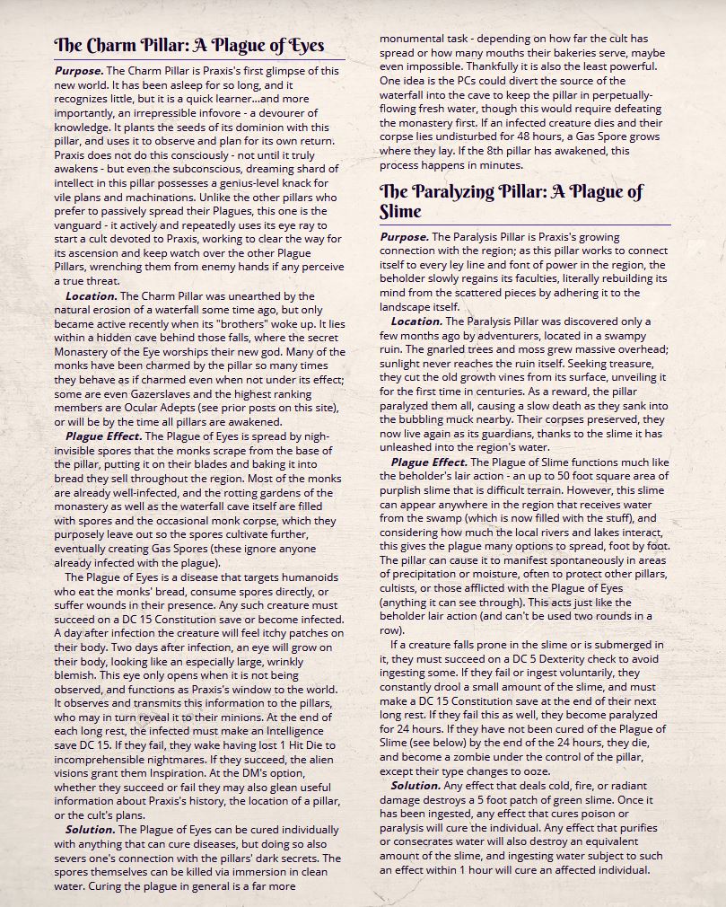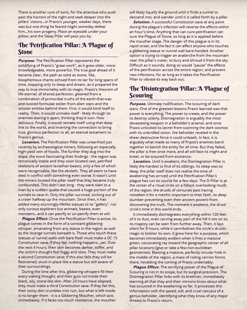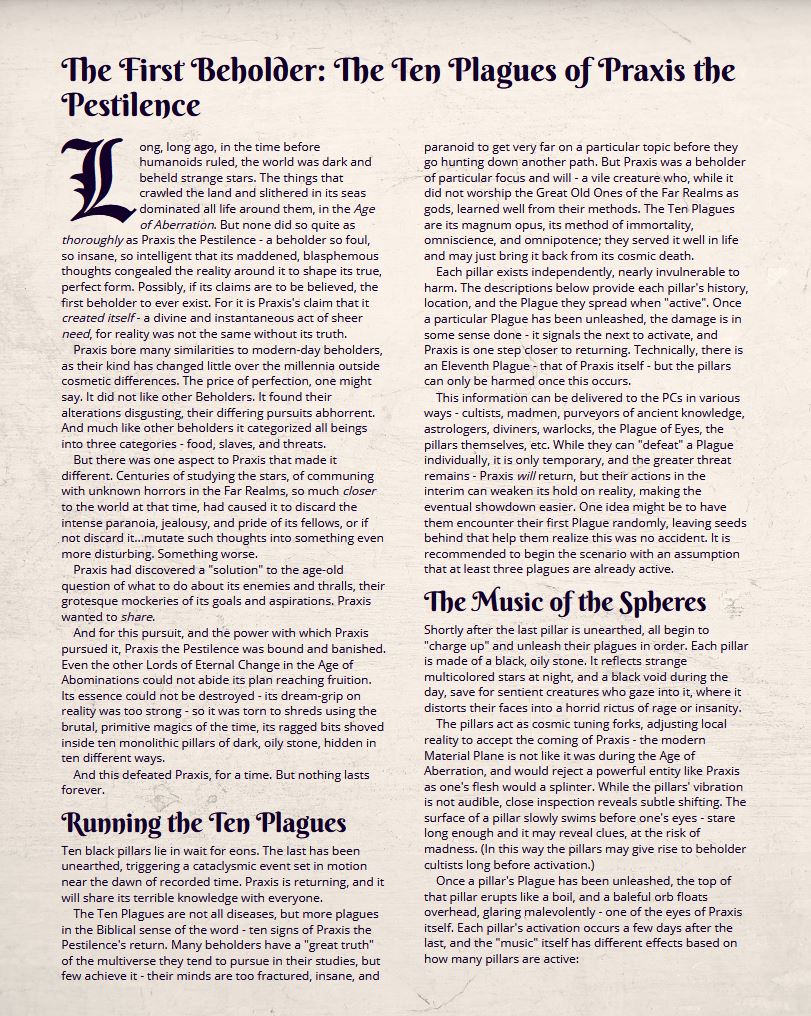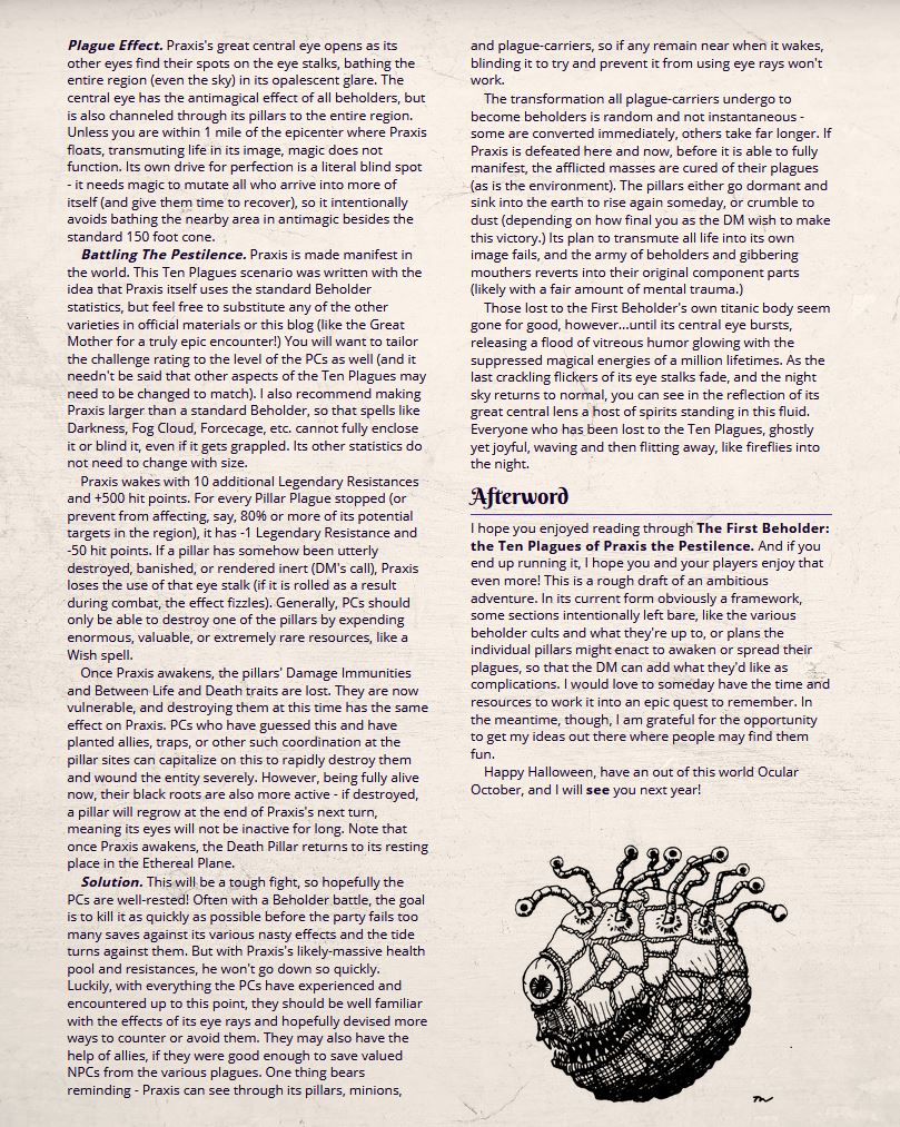 But I knew I still had to do something! It’s Ocular October dammit! So I resolved to forge ahead with the ambitious project I’d planned – which would require a lot of cross-referencing anyway, rather than individual posts – and just release it all at the end of October. So I did – burned the midnight oil, stared at pages until my own eyes felt like their eyelids didn’t exist and could shoot magic lasers, and knocked out The First Beholder: a story of the Ten Plagues of Praxis the Pestilence. This is a fully-realized adventure path you can put your PCs on (or just read for funsies), and of course I decided to get “real weird with it” at times. I hope you enjoy it!