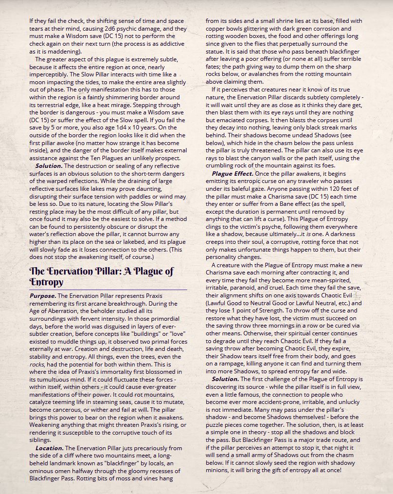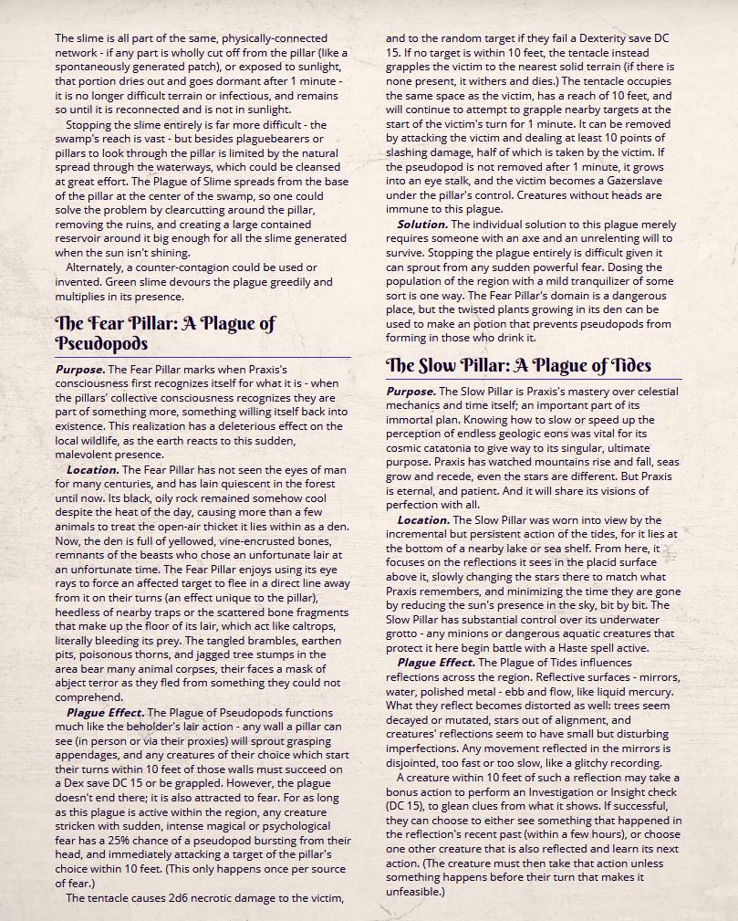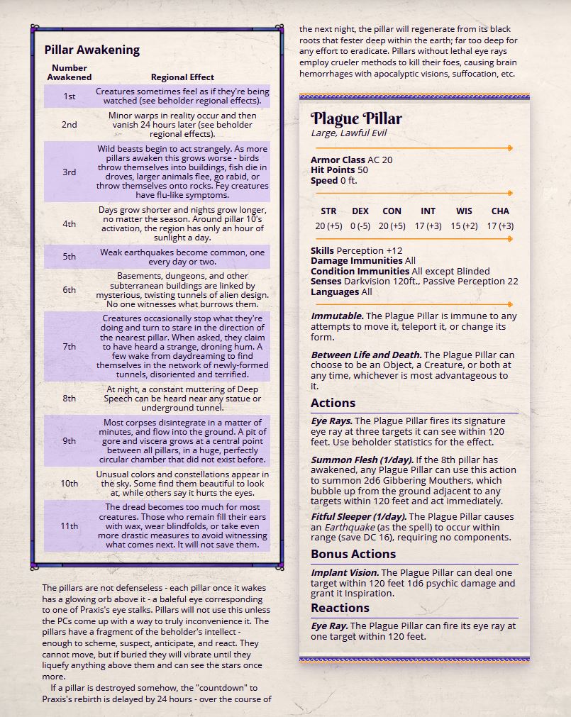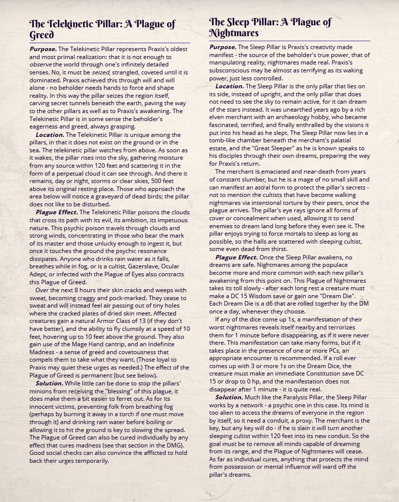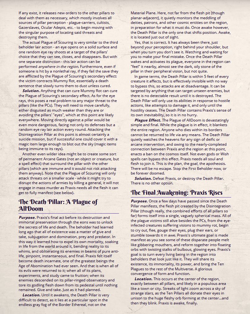 But I knew I still had to do something! It’s Ocular October dammit! So I resolved to forge ahead with the ambitious project I’d planned – which would require a lot of cross-referencing anyway, rather than individual posts – and just release it all at the end of October. So I did – burned the midnight oil, stared at pages until my own eyes felt like their eyelids didn’t exist and could shoot magic lasers, and knocked out The First Beholder: a story of the Ten Plagues of Praxis the Pestilence. This is a fully-realized adventure path you can put your PCs on (or just read for funsies), and of course I decided to get “real weird with it” at times. I hope you enjoy it!