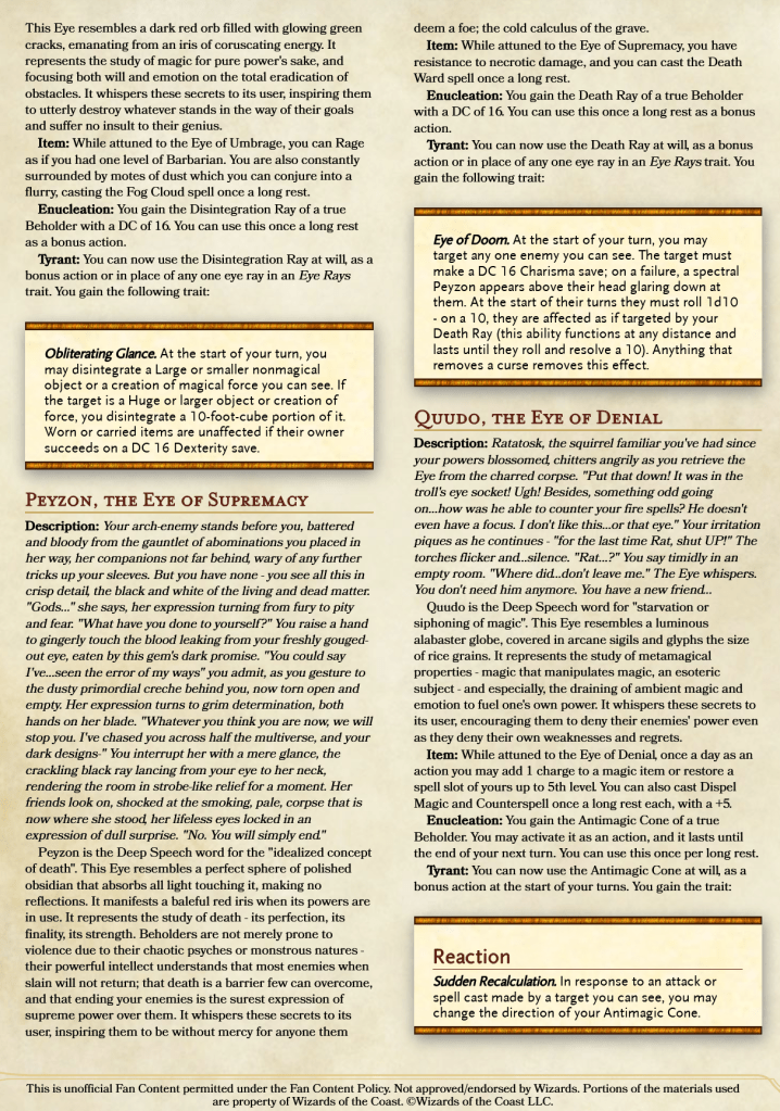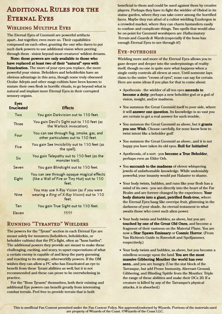 The last three Eternal Eyes represent some of the darkest and strongest powers a beholder can wield – as well as some of their deepest and strangest mindsets and theories on reality. Beyond that, the Additional Rules section provides the “sight-beyond-sight” that wielding (and sacrificing for) multiple Eyes at a time can grant, right up til you see through the veil of reality itself. It also contains advice on how to run “Tyrant Bosses” empowered by the Eternal Eyes, and a section brainstorming some ideas on what to do when someone (or someTHING) collects all ten!