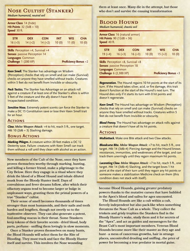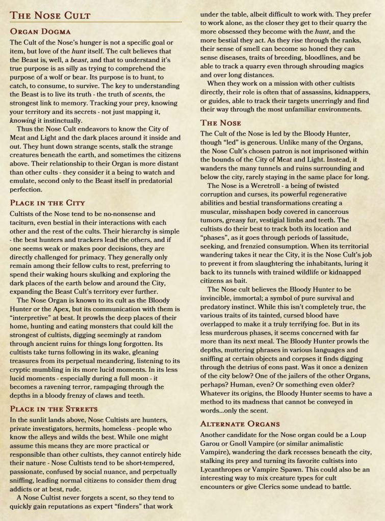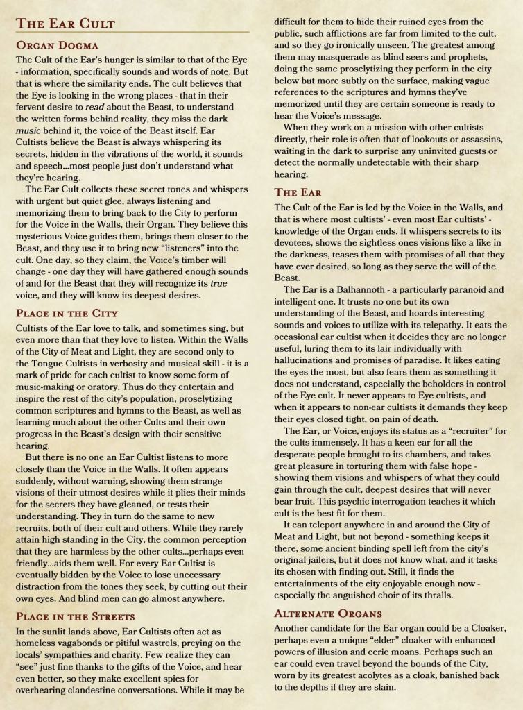 This entry covers the three so-called “Sensory Cults” of the Beast – the Eye, Ear, and Nose Cults. Their dogma, their masters, and some stat blocks for their vicious and hungry members!