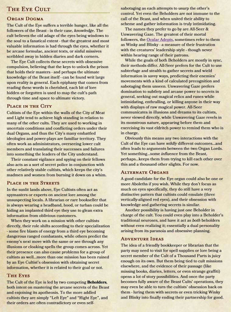 This format should continue through the rest of the cults (unless I end up hating it for some reason), and I hope to lay out all ten by the end of this Ocular October. That means 2-3 more entries covering the “Manipulation Cults” (Maw, Foot, Hand, and Tongue) and the “Buried” or “Internal Cults” (Heart, Brain, Soul), and possibly some extra material if I have time. Note that in the end these are all just examples – want to cut it down to just a few cults? Feel free! Need more than ten? Make up your own! Maybe there’s a Bone Cult obsessed with calcium or a Lung Cult that’s all about crazy breath powers – there’s a lot of room in this concept for more!